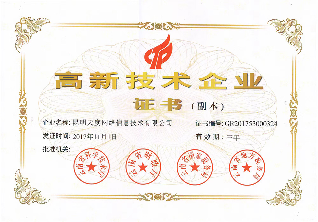 尊龙凯时旗下云南蔚岚信息技术有限公司、云南尊龙凯时科技股份有限公司、云南尊龙凯时软件系统有限公司、昆明尊龙凯时网络信息技术有限公司、重庆尊龙凯时网络信息技术有限公司等5家企业获得国家高新技术企业认定。