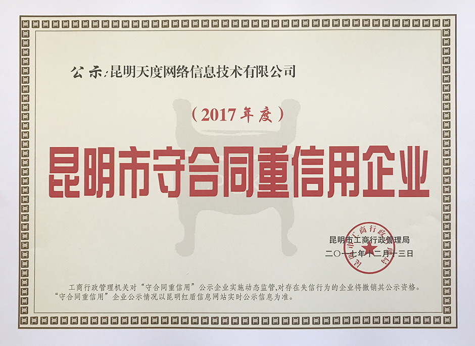 经昆明市人民政府“守合同重信用”领导小组办公室(昆明市工商行政管理局)组织推荐、昆明市人民政府“守合同重信用”领导小组成员单位联合审查和通过媒体公示接受社会各界监督等工作程序,已完成公示认定工作。热烈祝贺昆明尊龙凯时网络信息技术有限公司被昆明市工商行政管理局评为2017年度“昆明市守合同重信用企业”。