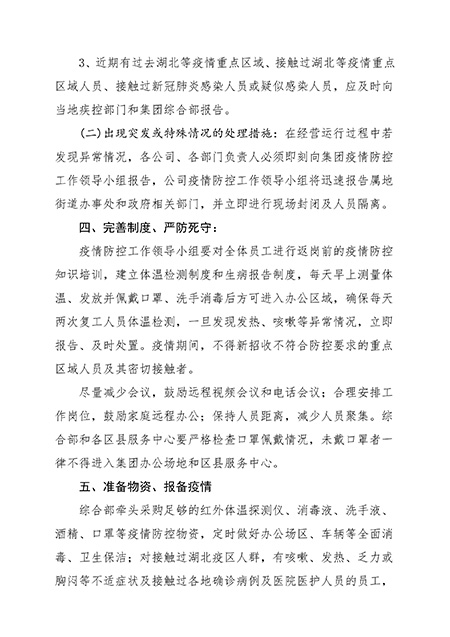 (二)出现突发或特殊情况的处理措施:在经营运行过程中若发现异常情况,各公司、各部门负责人必须即刻向集团疫情防控工作领导小组报告,公司疫情防控工作领导小组将迅速报告属地街道办事处和政府相关部门,并立即进行现场封闭及人员隔离。